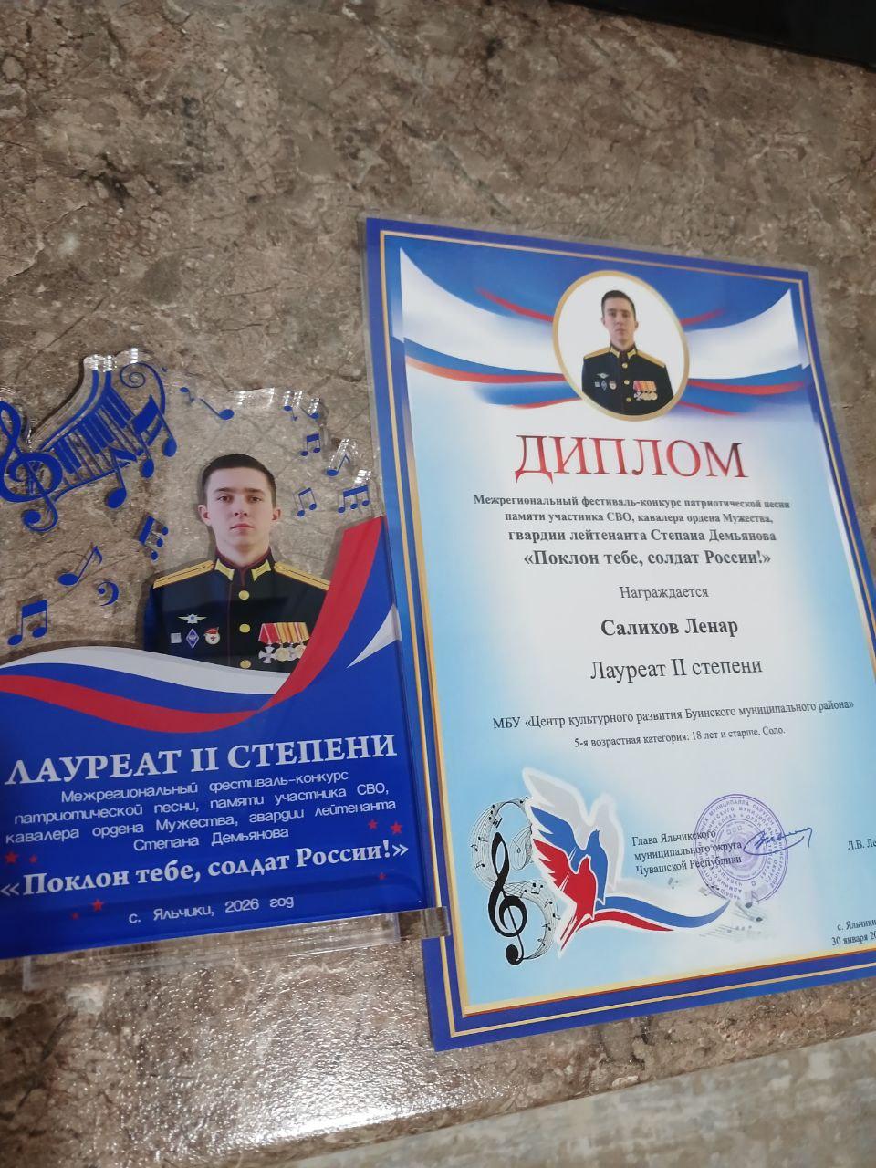 30 января Ленар Салихов и Виктор Моисеев представили Буинск на межрегиональном фестивале-конкурсе патриотической песни, посвящённом памяти участника СВО, кавалера ордена Мужества, гвардии лейтенанта Степана Демьянова, который проходил в Яльчиковском РДК Республики Чувашия.