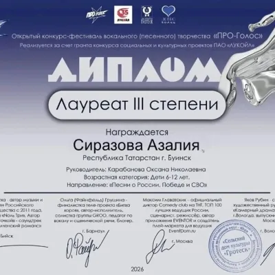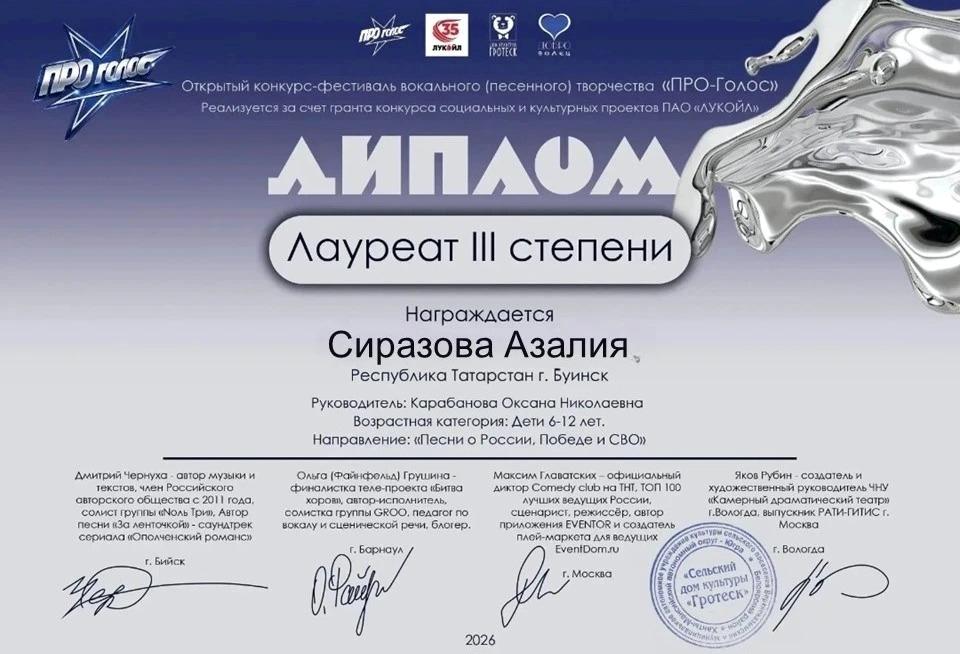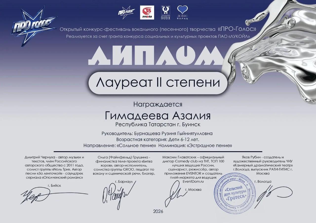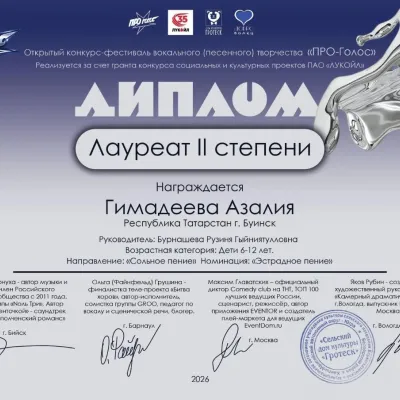 Гимадеева Азалия, участница детского вокального ансамбля "Капельки" под руководством Рузини Бурнашевой, стала лауреатом II степени на Открытом конкурсе-фестивале "ПРОГолос" в номинации "Эстрадное пение" в категории "Сольное пение".