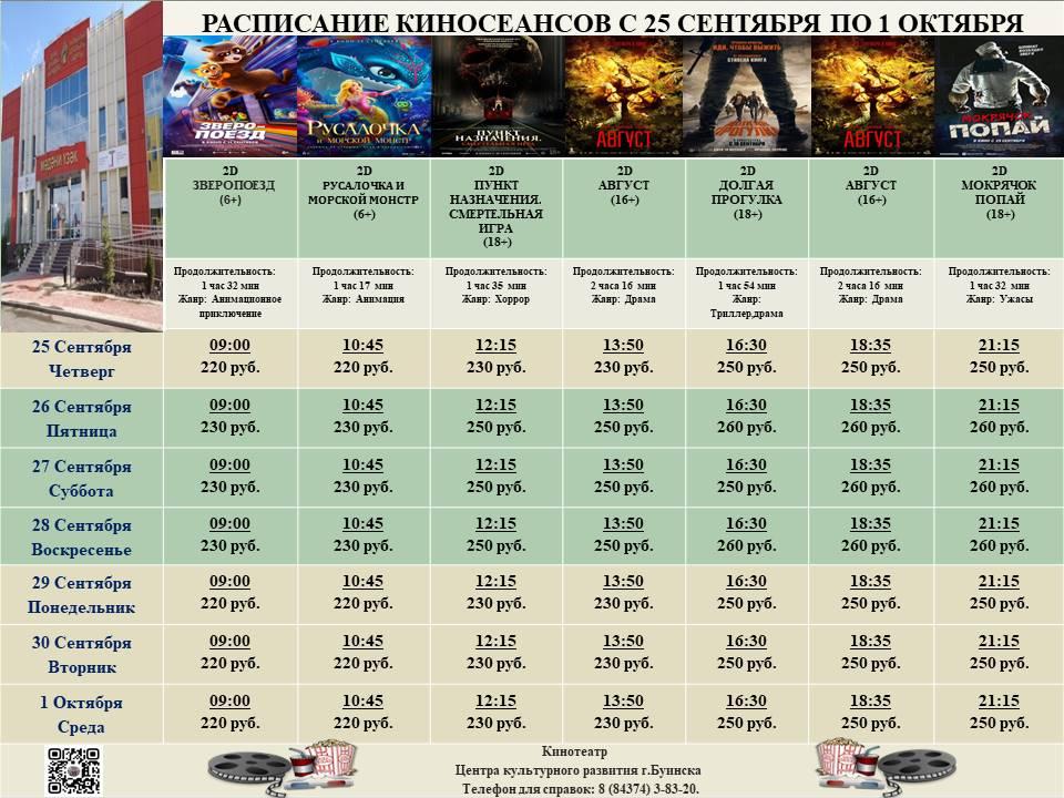 Расписание кинотеатра Центра культурного развития с 25 сентября по 1 октября.