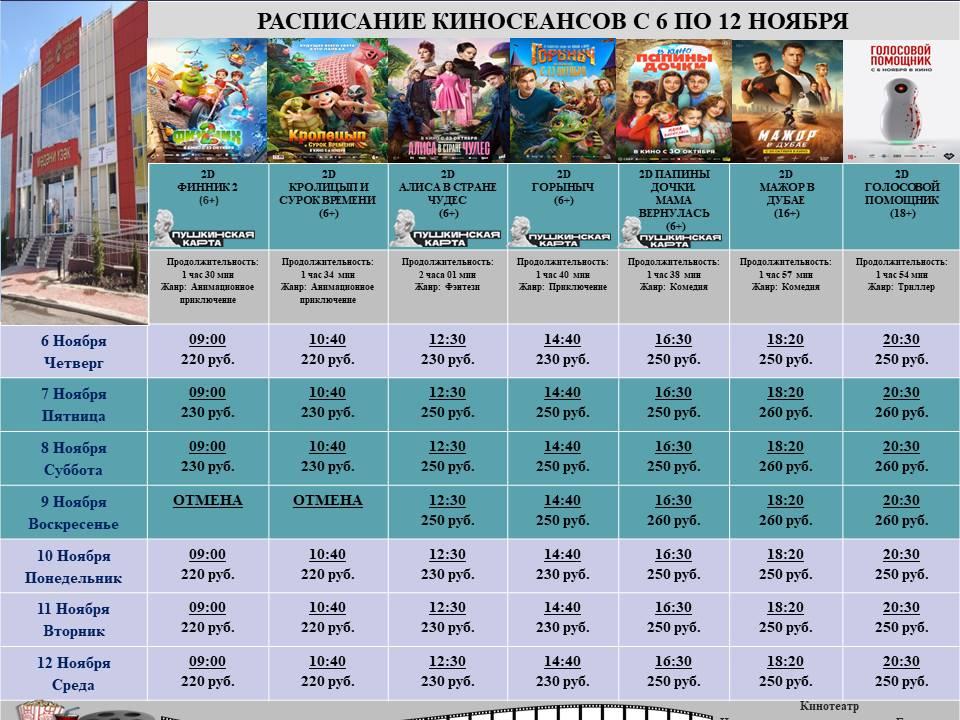 Расписание кинотеатра Центра культурного развития с 6 по 12 ноября.