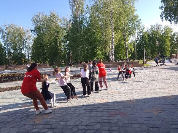 Ребята разделились на две команды и соревновались в различных состязаниях : "Передай мяч другому", "Бег в мешках ", "Перетягивание каната".