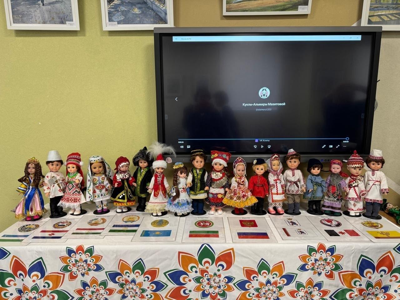 В экспозиции представлены куклы в различных народных костюмах: башкир, мордвы, азербайджанцев, удмуртов, узбеков, якутов, японцев, кряшен, татар, русских, чувашей и других народов.