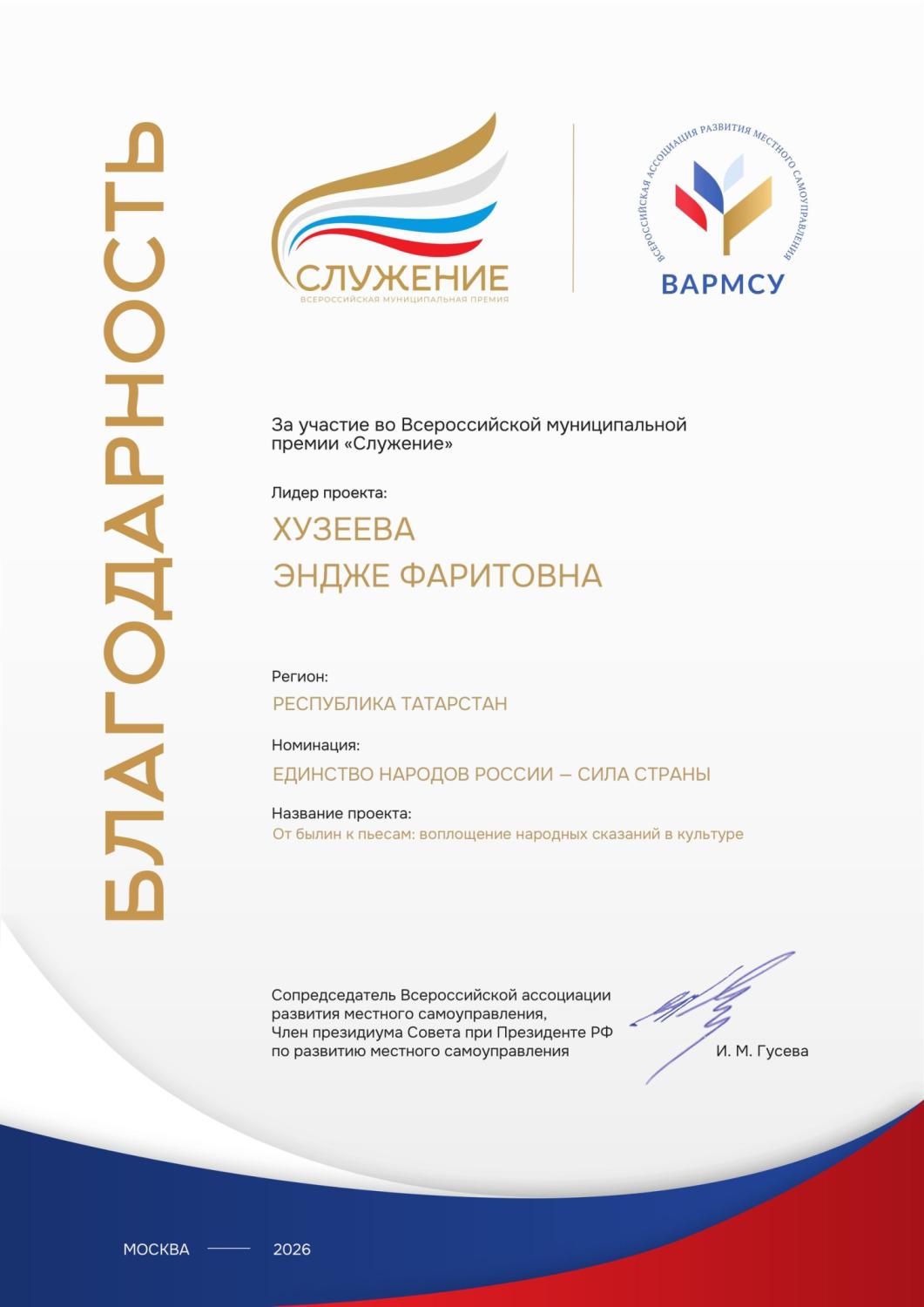 Нами был представлен социальный проект "От былин к пьесам: воплощение народных сказаний в культуре", целью которого является поддержка исторического прошлого нашей малой Родины через театральное творчество. Хотя наш проект не получил поддержку в рамках премии, он был отмечен Благодарностью — этим мы гордимся! Благодарим команду авторов проекта за их труд, креативность и преданность делу.